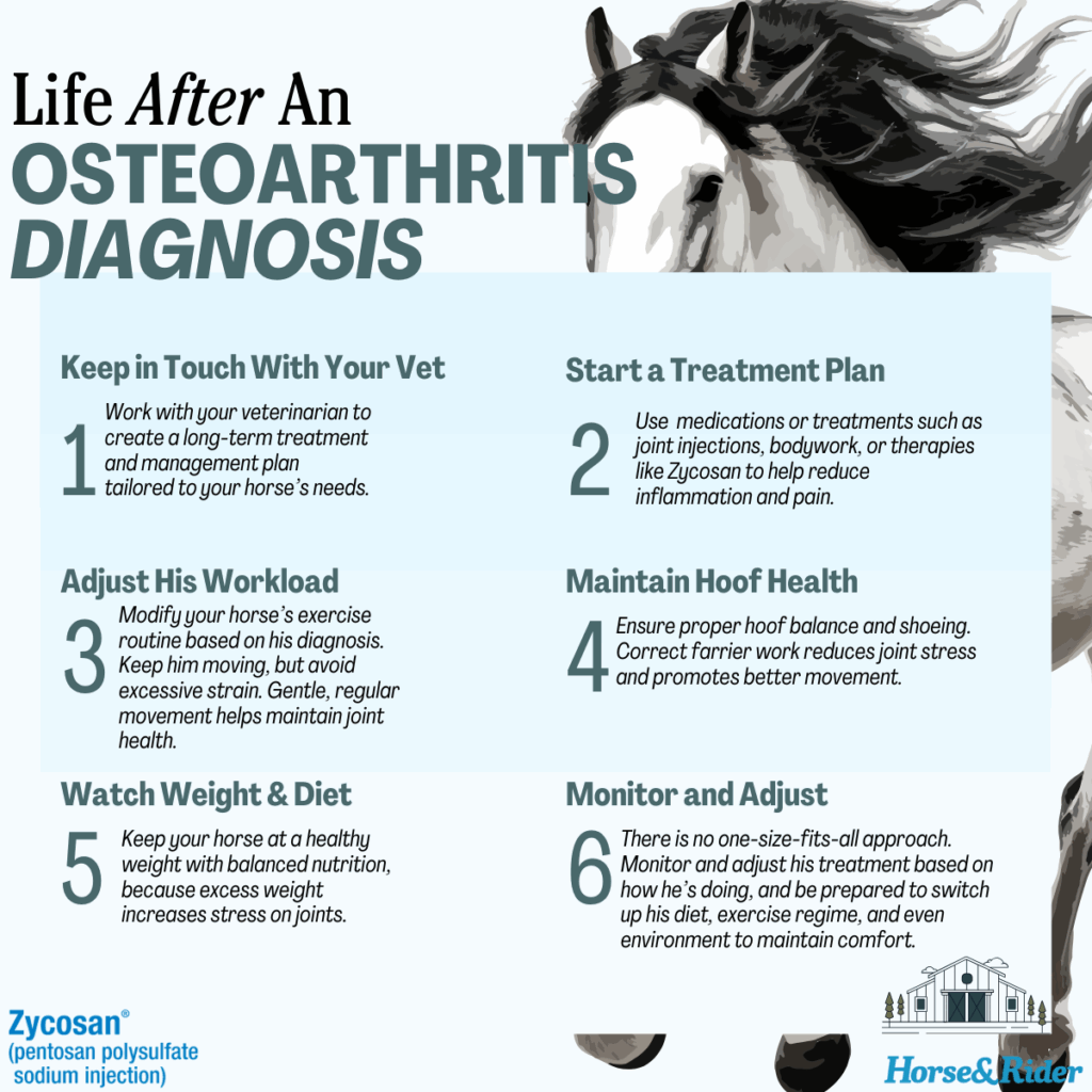 An osteoarthritis diagnosis is scary. But it doesn’t mean that your horse’s best days are behind him, and it certainly doesn’t mean he needs to stand in a stall for the rest of his life. Although the condition can’t be cured, treatment is available and many horses continue to thrive long after their diagnosis. Your horse’s workload, diet, and treatment protocol might look a little different depending on the severity of his condition, but OA can be managed and life will go on after his diagnosis.
