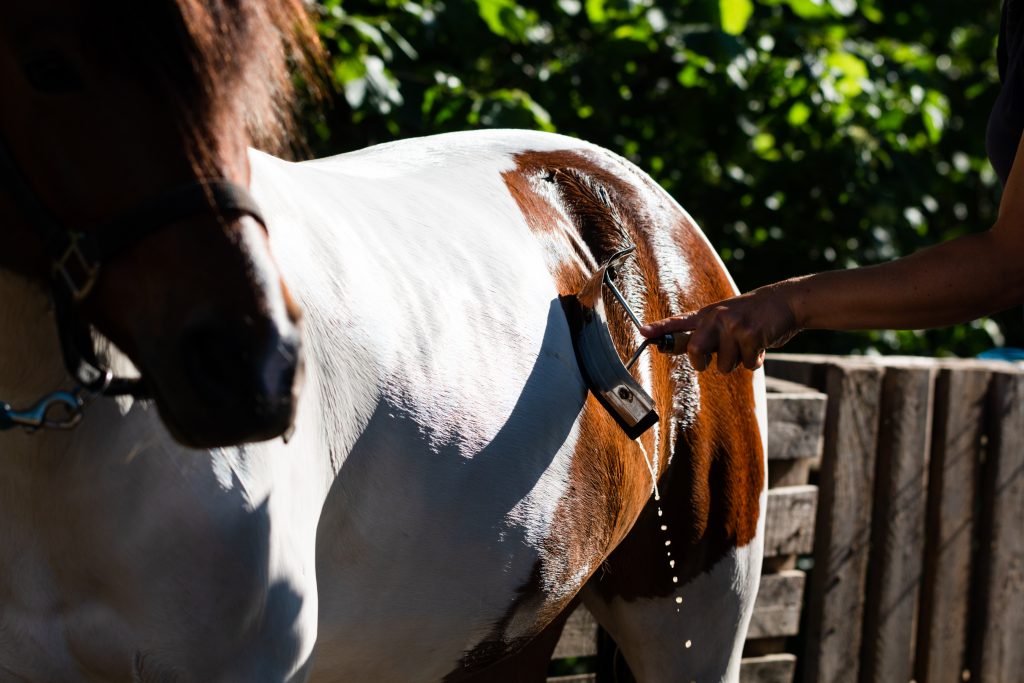 Instead of just using the hose to get the suds off your horse, try using the sweat scraper a few times while you’re rinsing away the suds. This will give you a little extra help with getting all of the suds out of your horse’s coat.
