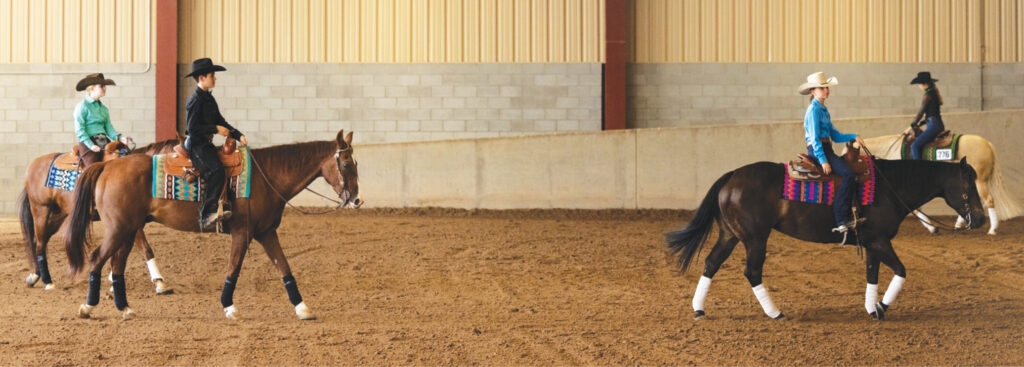 Kids won’t know what to expect unless they get a taste of it at home. We try to duplicate the show experience at home with a variety of riders in the arena, from walk-trot kids to more advanced horsemen, so it’s as close to a real event warm-up pen as possible. Then we work on things like passing, riding left shoulder to left shoulder when going in opposite directions, staying on the rail and riding into the corners, and approaching the center of the arena for a lineup.