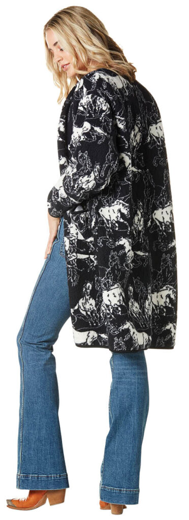 As the weather cools down, you’ll want this Sherpa cardigan to keep you warm. This knee-length cardigan will pair with nearly any outfit thanks to its simple black-and-white coloring. And with a bold, layered horse pattern, you’ll have a subtle Western vibe that ties your entire outfit together. $44; wrangler.com.