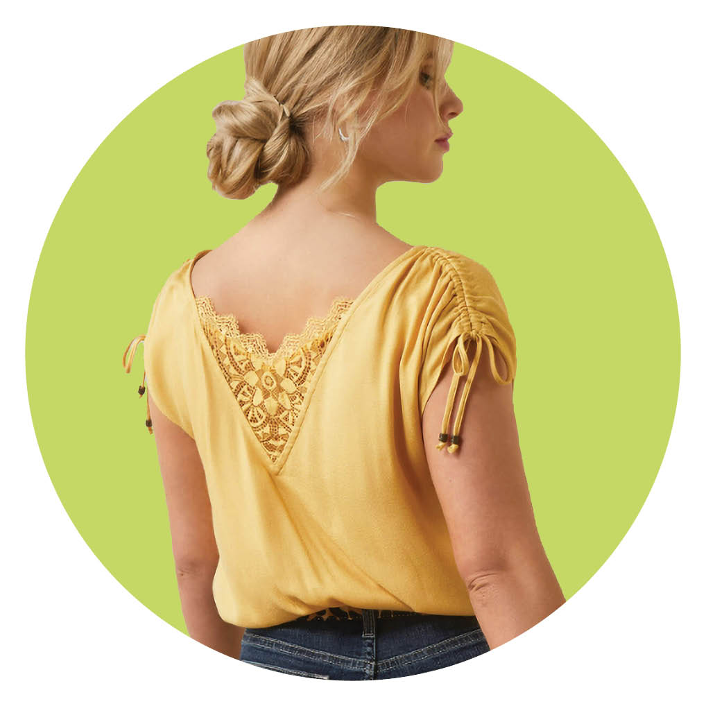 Add some brightness to your outfit with this lightweight, slightly fitted crop top. It pairs perfectly with your favorite pair of high-waisted jeans, and with lace trim in the back and self-tie closures on the sleeves, will look good by itself or paired with a lightweight jacket. $35.95; ariat.com.