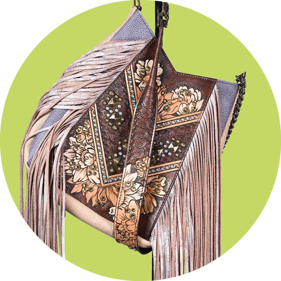 Lainey Wilson sported a bag from this collection on the hit TV series Yellowstone. This handcrafted bag will catch eyes from around the arena thanks to the beautiful floral leatherwork and metallic fringe. The adjustable chain strap allows you to wear it as a crossbody or shoulder carry. $1,600; heritagebrand.com.