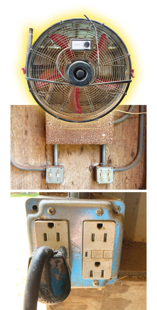 The Wellmanns now have dedicated plugs for fans and lights. They’ve installed plugs above the stalls where the conduit and wires are, among other locations. And they planned the plugs and lights to make sense for their barn routines.