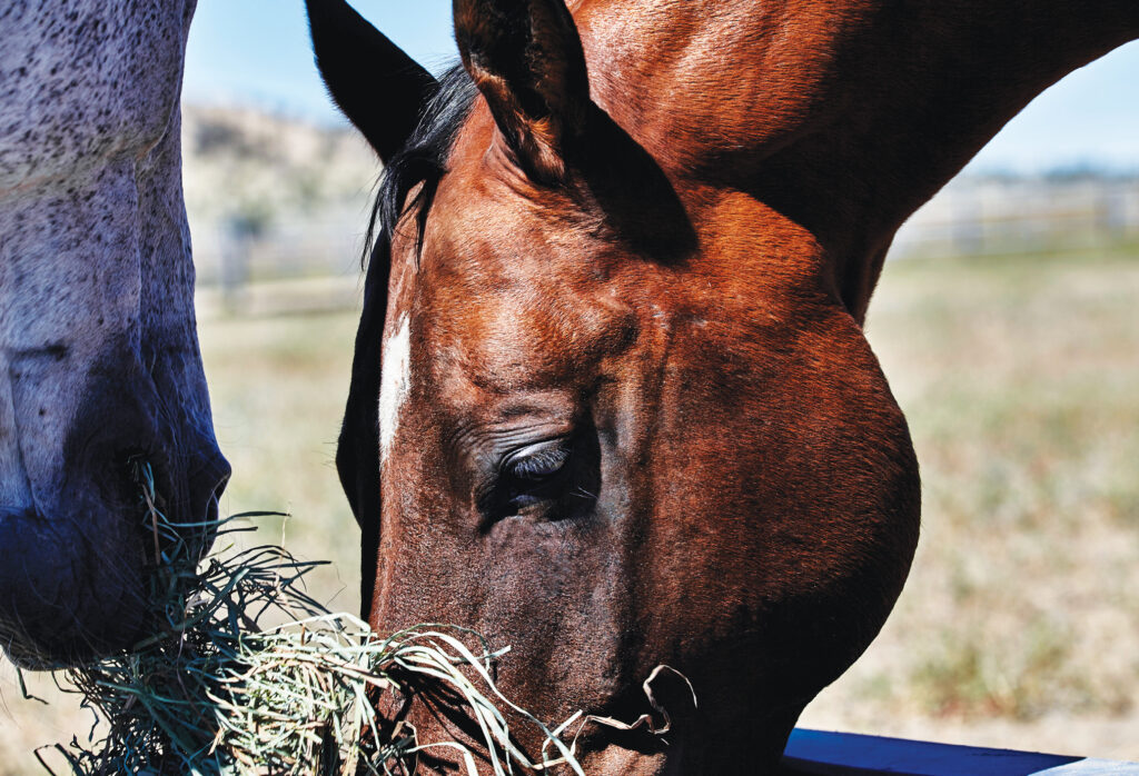 Opt to feed him by himself until he settles into his new environment. This is so he isn’t battling new herd dynamics at the same time, which can put him off feed. Be watchful for signs of gastric ulcers that can occur from stressful situations. These include weight loss, dull coat, behavior issues, and grinding of teeth. When bringing in a horse that is likely to have ulcers, such as one off the track, some folks like to administer GastroGard (Omeprazole) and Sucralfate for 30 days.