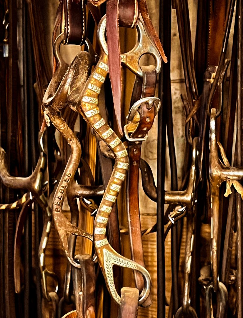 And what a collection it is. In a saddle house filled with gear, each piece has meaning and a purpose. One of the most cherished pieces though, is a Klapper 27 bit made by the famous Billy Klapper. Others include a bit from the collection of Richie Morgan bought with the blessing of his daughter, Merrilee Doss. And adorning the hooks are multiple, beautiful pieces made by Peewee Peebles.