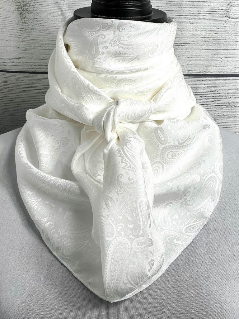 Whether you’re adding for fashion or functionality, this 100% silk handmade wild rag is sure to make a statement. More than just white, the matte- textured fabric with paisley background makes this scarf a must-have for the show ring. $59; wildwestragco.com.