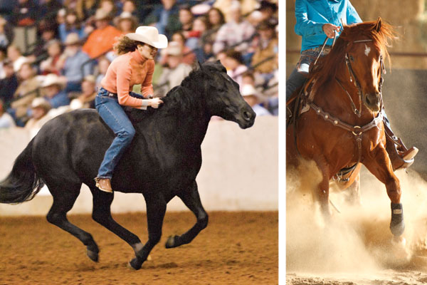 Credit: LEFT: H&R file photo; RIGHT: Photo by Alana Harrison Roxy, who became the first freestyle reining champion to compete without tack, was intimidated by high-speed maneuvers. Jac, her bolder offspring, is the opposite. His confident nature allows him to remain bold even at high speeds.
