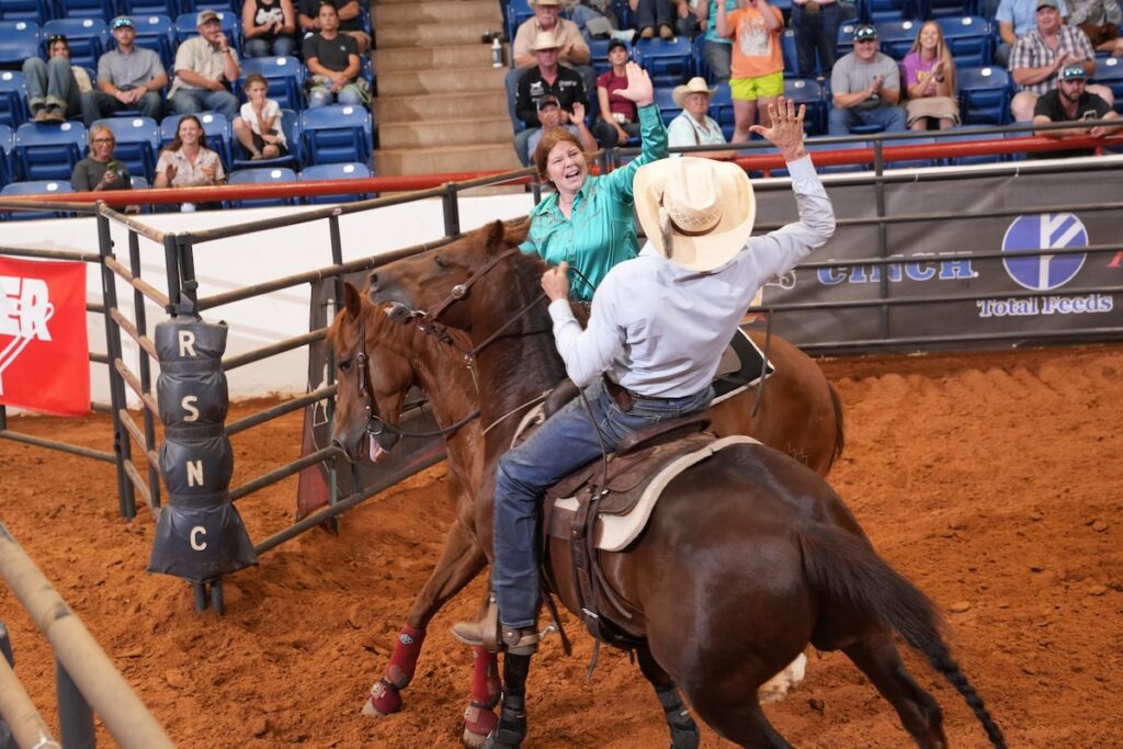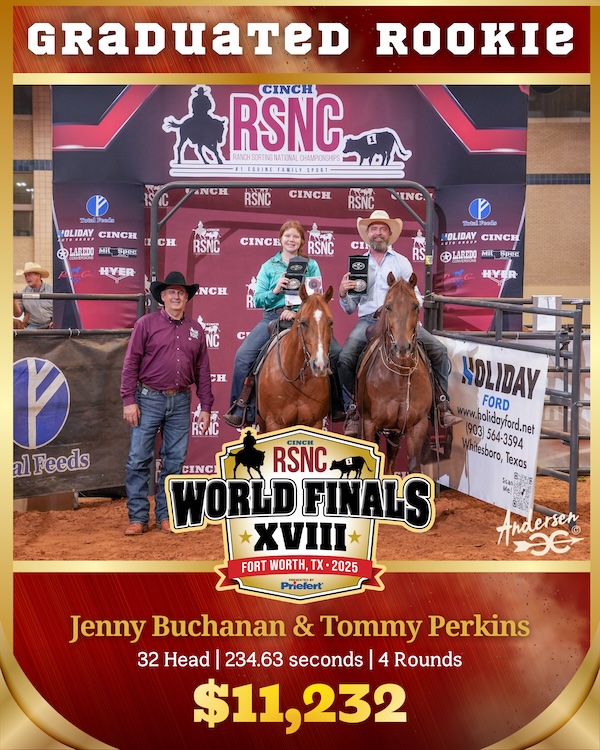 Jenny Buchanan of Harrisburg, Illinois, and Tommy Perkins of Carbondale, Illinois, didn’t plan to ride together in the Graduated Rookie class at the 2025 Cinch RSNC World Finals, but a last-minute opening and a familiar partnership were the first steps to becoming Graduated Rookie World Champs and winning $11,232 for their efforts on 32 head.