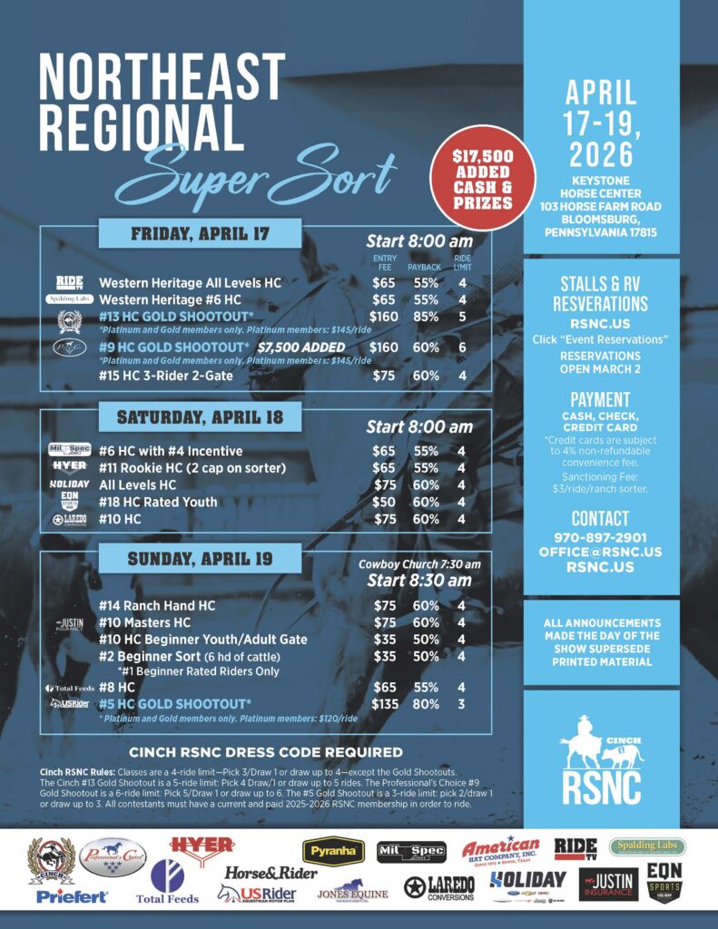 What: A three-day Cinch RSNC Ranch Sorting event at the Keystone Horse Center in Bloomsburg, Pennsylvania, from April 17-19, 2026 paying out $17,500 in added cash and prizes. The event provides a range of classes of all levels of riders and also features opportunities for ranch sorters to participate in the elite Gold Shootout classes.