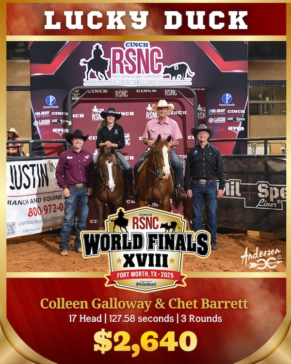 The Lucky Duck—a fast-paced, drag race–style shootout—is for ranch sorters who finish just one spot out of the money during the Cinch RSNC World Finals and, for Colleen Galloway and Chet Barrett, the class lived up to its name, delivering a world championship title and a $2,640 payday for sorting 17 head in 127.58 seconds across three rounds.