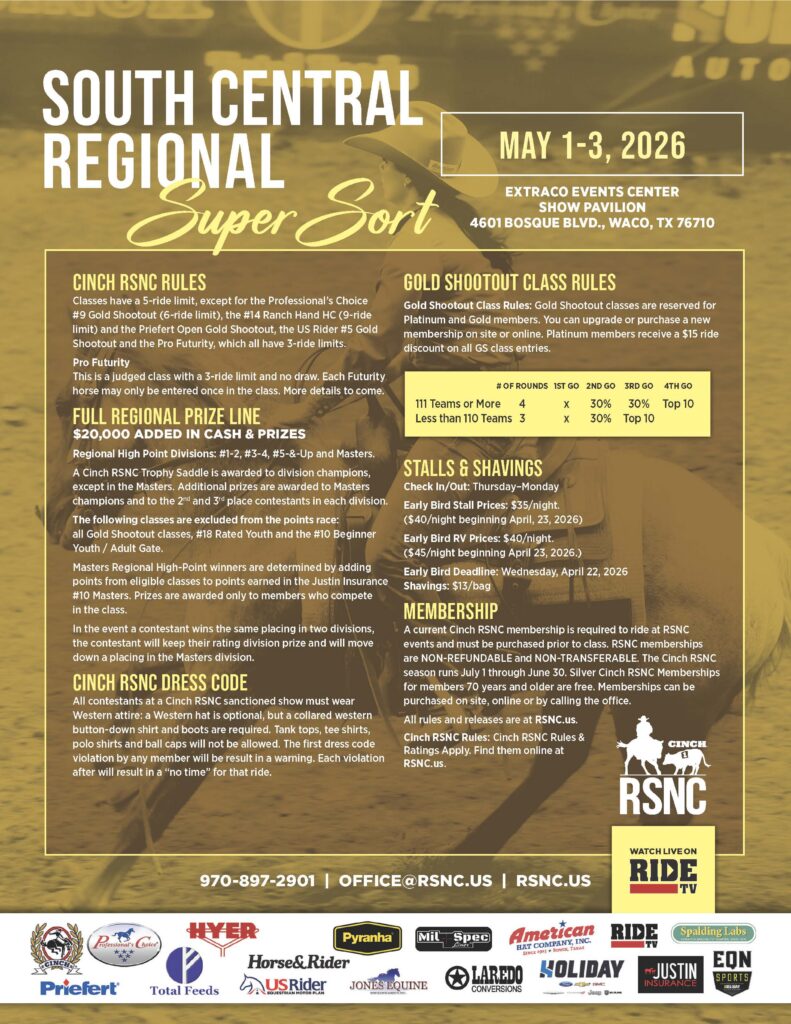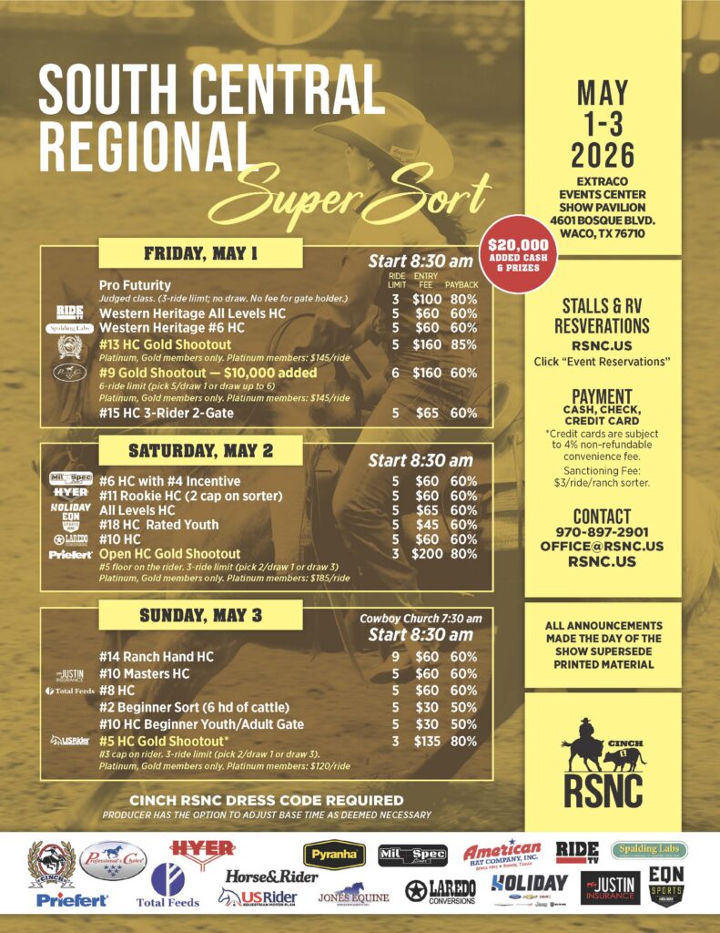 What: A three-day Cinch RSNC Ranch Sorting event at the Extraco Events Center Show Pavilion in Waco, Texas, from May 1-3, 2026 paying out $20,000 in added cash and prizes. The event provides a range of classes of all levels of riders and also features opportunities for ranch sorters to participate in the elite Gold Shootout classes.