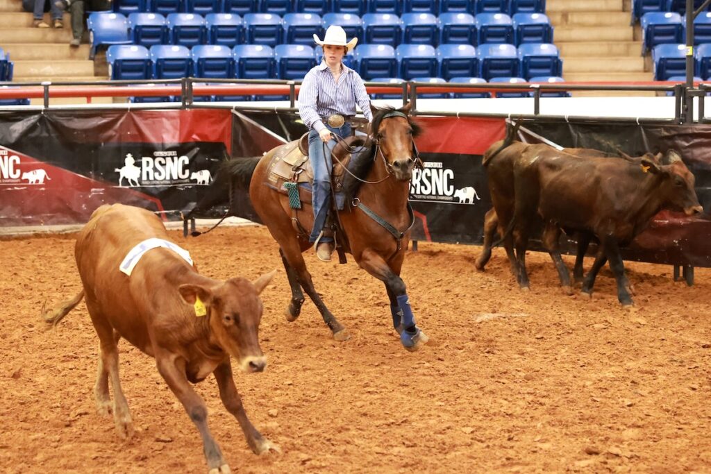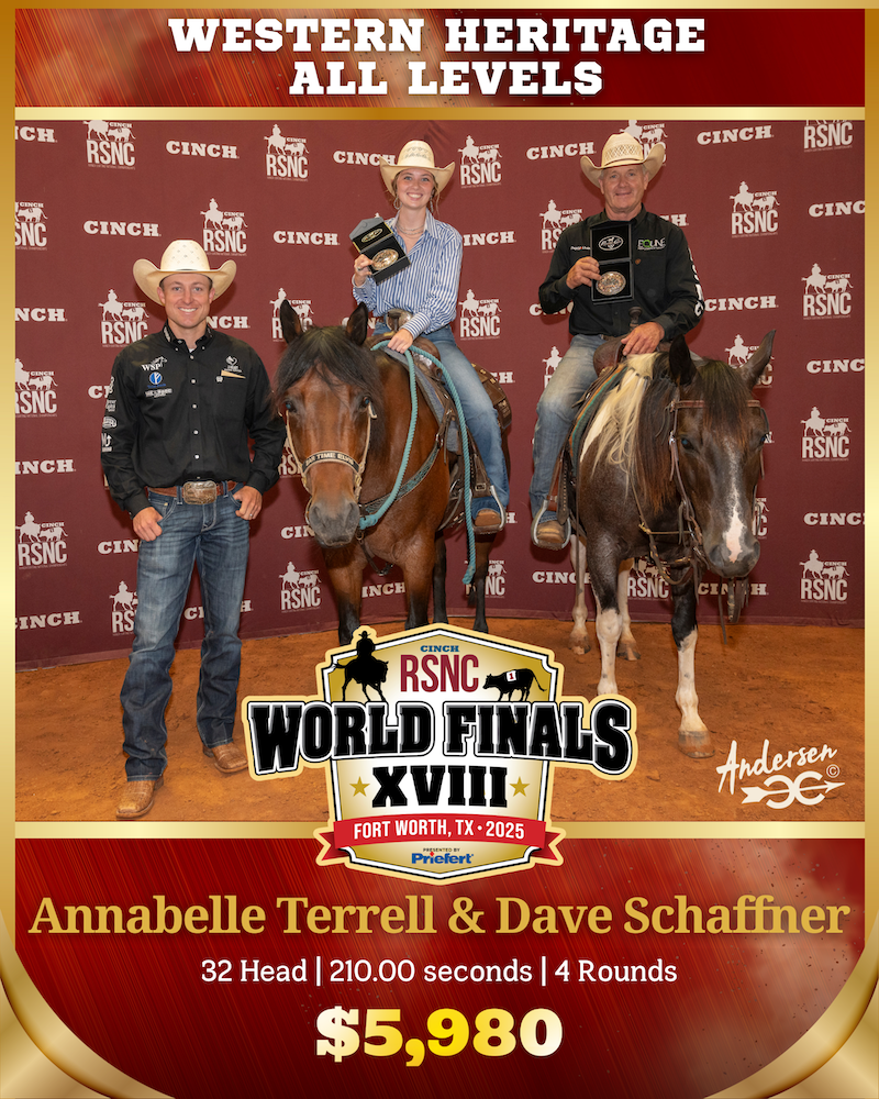 Through horsemanship, strategy, and grit, Texas’ home team of Annabelle Terrell and Dave Schaffner captured the world championship title in the Western Heritage All Levels ranch sorting class at the 2025 Cinch RSNC World Finals. The well- matched Open riders sorted an impressive 32 head of cattle in just 210.00 seconds across four rounds to take home $5,980 in prize money—edging out the reserve champions by four head and less than four seconds.