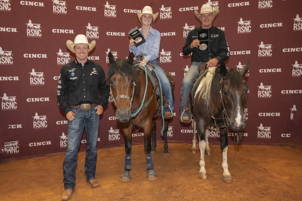 Schaffner, a well-known trainer and clinician in the sport who has coached in the some of the farther reaches of the world, competed aboard Sir Winston (Ima Dirty White Boy x Lenas Little Smarty), a paternal grandson of Peptoboonsmal. “Winston” is a striking black-and-white 2018 tobiano owned by Angela and George Jensen, who sponsored the trophy buckles for this year’s Chrome Cash Futurity World Championships.