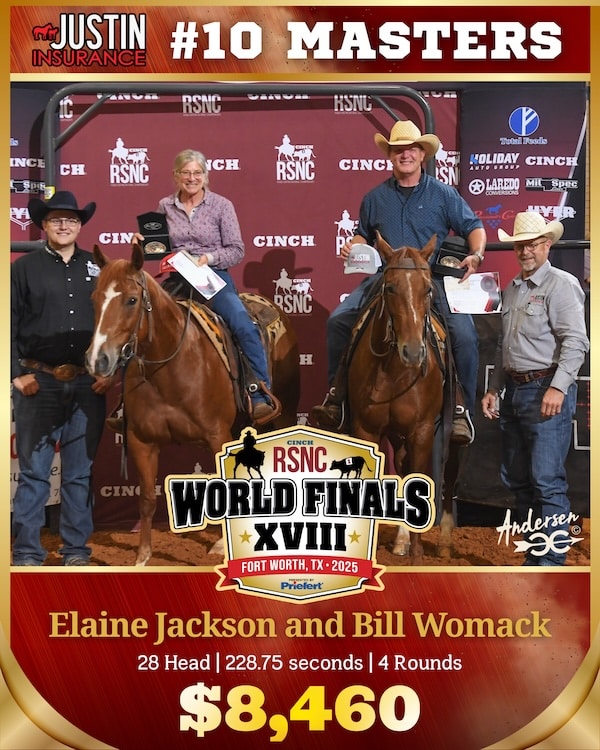 Elaine Jackson and Bill Womack sorted 28 head in 228.75 seconds over four rounds to earn the Justin Insurance #10 Masters World Championship.