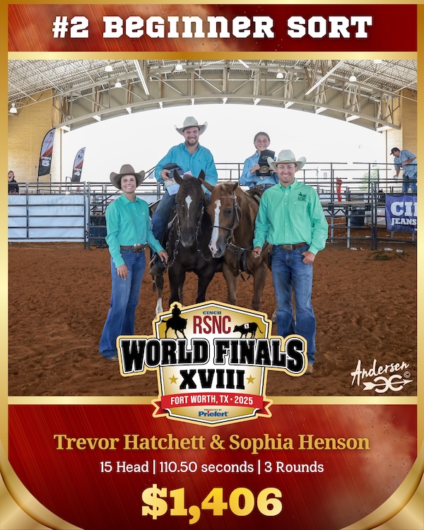 First-time Cinch RSNC World Finals competitors Trevor Hatchett of Lexington, Tennessee, and Sophia Henson of Hornsby, Tennessee, captured the #2 Beginner Sort world championship Friday at the 2025 Cinch RSNC World Finals, out-sorting 100 other teams with a flawless three-round performance to win $1,406.