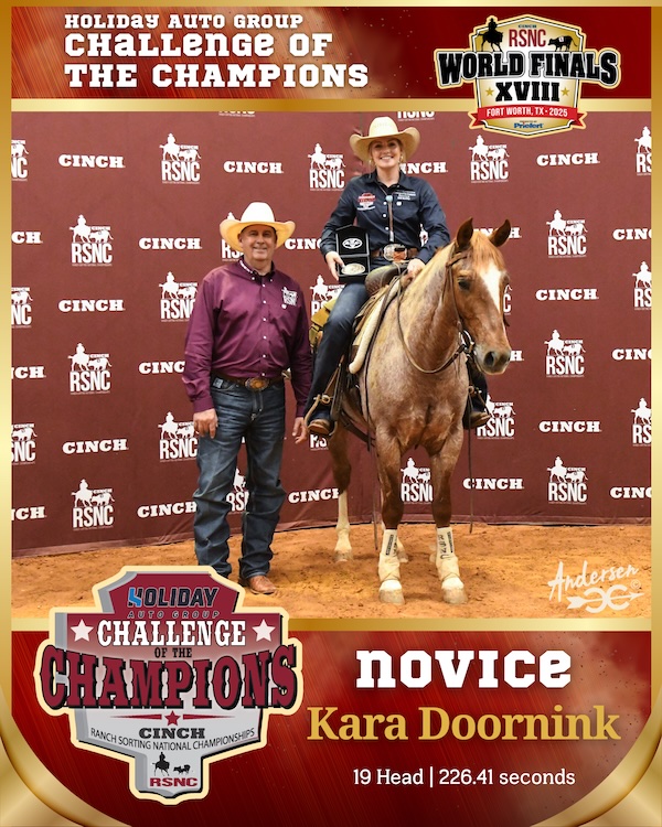 At the 2025 Cinch RSNC World Finals, four standout ranch sorters—Kody Ward, Aubree Coker, Kara Doornink and Nicki Fuller—won their divisions in the Holiday Auto Group Challenge of the Champions, an elite event featuring the best of the best. The class showcases the highest-earning ranch sorters from the season, with only the top five riders from each division—Open, Amateur, Novice and Rookie—invited to compete. A sudden-death, round-robin format means each contestant rides with every other in their division. Final standings are then based on the total number of cattle sorted in the least amount of time