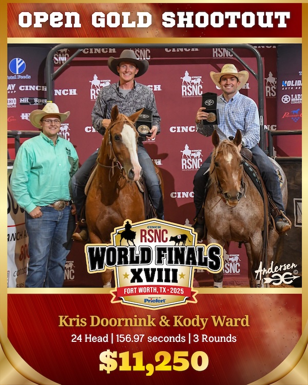 It may have been a smaller class, but the payout—and the pressure—were sky high in the Open Gold Shootout at the 2025 Cinch RSNC World Finals where the ranch sorting team of Kody Ward of Fort Lupton, Colorado, and Kris Doornink of Sundance, Wyoming, took home the win, a check for $11,250, and World Champion trophy buckles by Professional’s Choice.