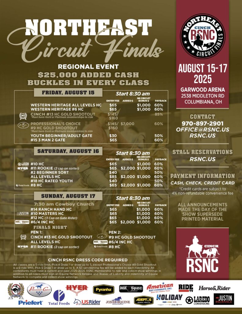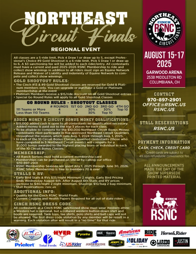The biggest and richest ranch sorting in the Northeast is heading to the Garwood Arena in Columbiana, Ohio, for the Cinch RSNC Northeast Circuit Finals. From Aug. 15-17, 2025, ranch sorters of all levels (everyone is welcome!) will be competing for their share of $25,000 in added cash and buckles awarded in every class.