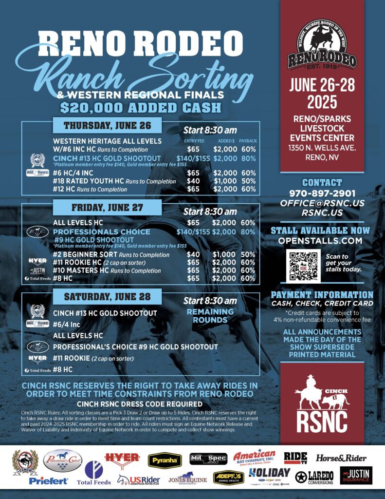 What: A three-day Cinch RSNC Ranch Sorting event at the Reno/Sparks Livestock Events Center in Reno, NV in association with the Reno Rodeo. The event provides a range of classes and awards competitors with $20,000 in added cash.