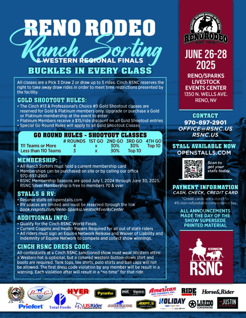 The Cinch RSNC is taking the Western Regional Finals to the Wildest, Richest, Rodeo in the West! Riders in the Western Region will join in on the Reno Rodeo action, competing for their share of $20,000 in added cash from June 26–28, 2025 at the Reno/Sparks Livestock Events Center in Reno, NV.