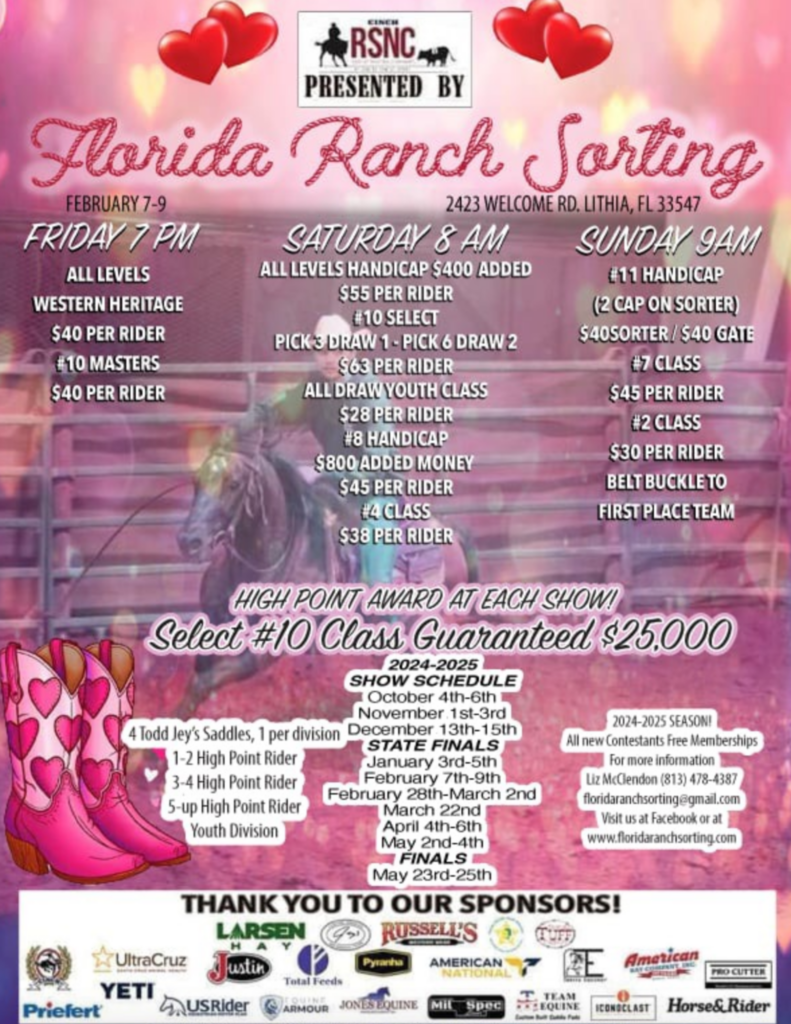 • Feb. 7-9 | Lithia, FL ~ Florida Ranch Sorting Arena | Liz McClendon #813-478-4387