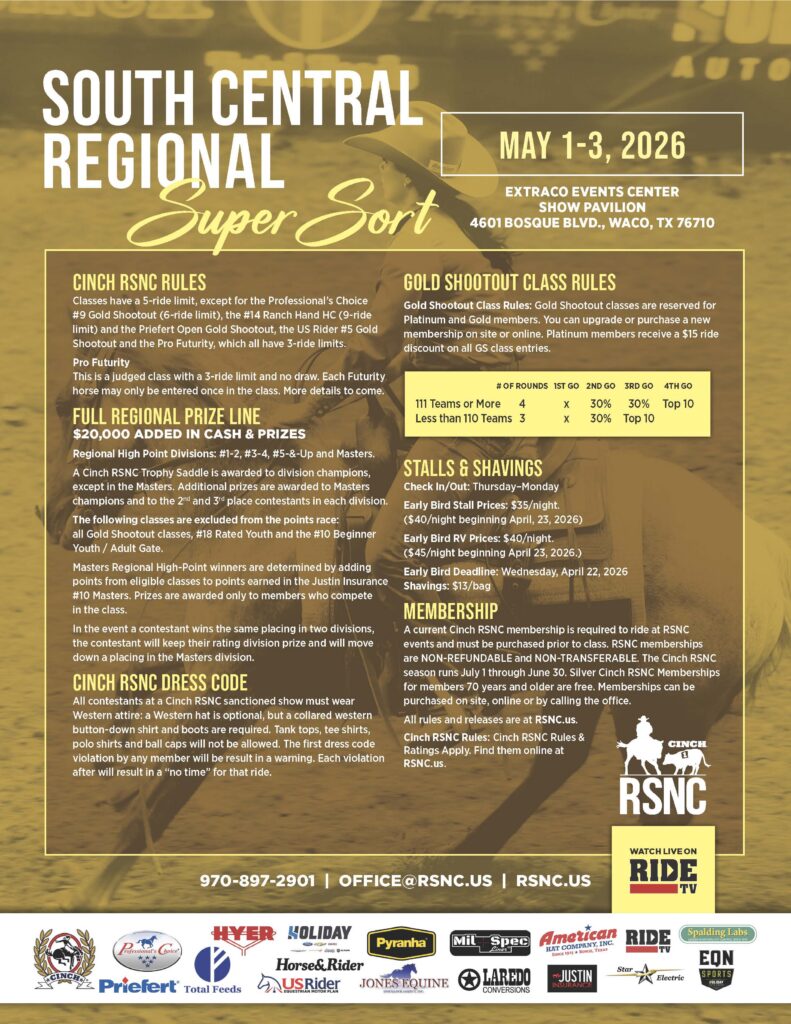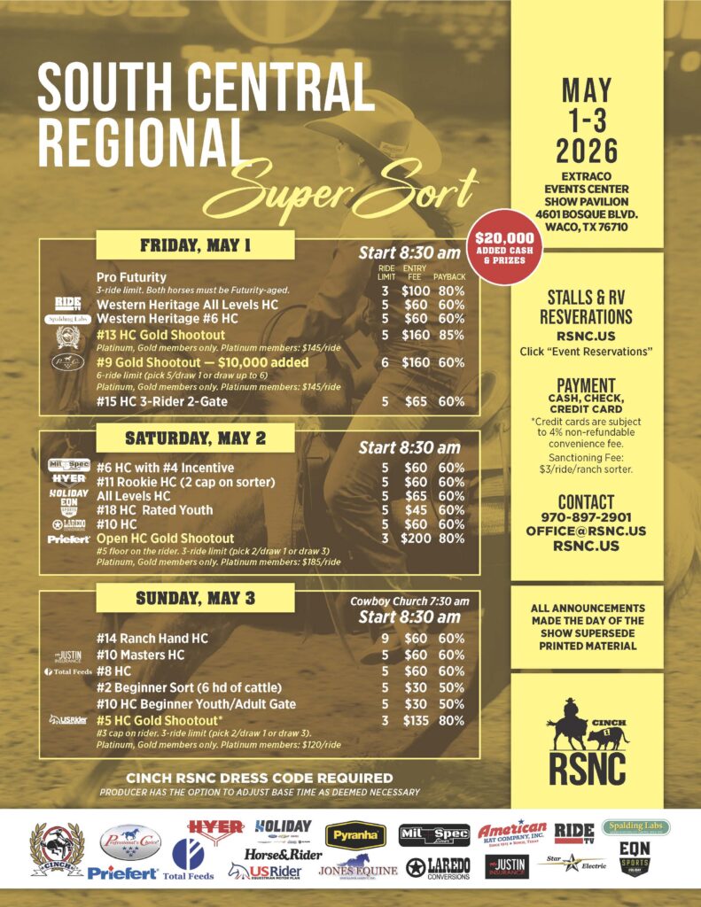 Ranch sorters are heading into a pivotal month as the final push toward the Cinch RSNC World Finals begins. May opens with the South Central Regional Super Sort in Waco, Texas, May 1-3, where competitors will battle for $20,000 in added cash and prizes. The momentum continues May 16-17 in Loveland, Colorado, at the North Central Regional Super Sort, featuring another $15,000 up for grabs. With World Finals qualification deadlines approaching, May events offer some of the last chances for riders to earn their spot in Fort Worth—making every run count.