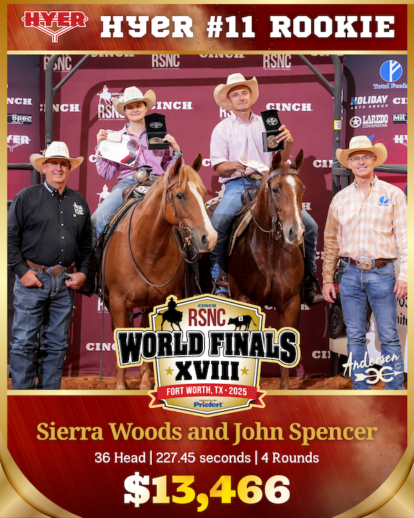 Sierra Woods of Edmond, teamed up with fellow Oklahoman John Spencer from Claremore, to claim their World Championship title and $13,466 for sorting 36 head in 227.45 seconds across four rounds of the Hyer #11 Rookie on June 11, 2025, in Fort Worth.