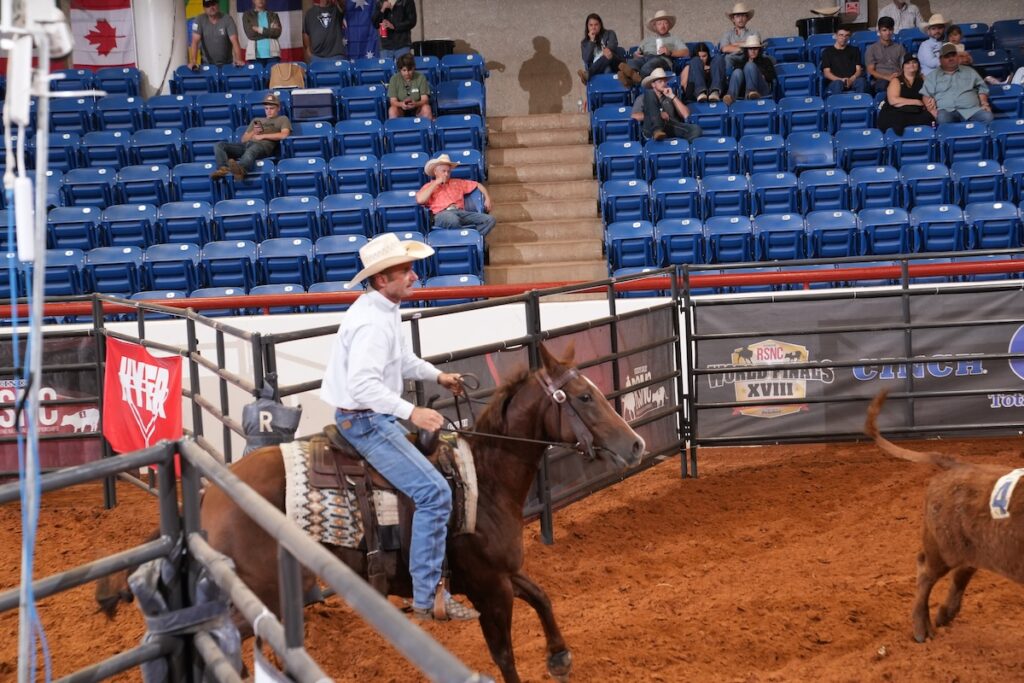 This year, he brought four mounts to the Cinch RSNC World Finals—three of his own, and one borrowed from his father-in-law. To hold the gate during the championship round with Woods, Spencer employed Asturia (Sigala Rey x Tassa Mia Rey II), a 2017 Quarter Horse mare that has been a reliable part of his string since he picked her up a couple of years ago from Patrick Witham.