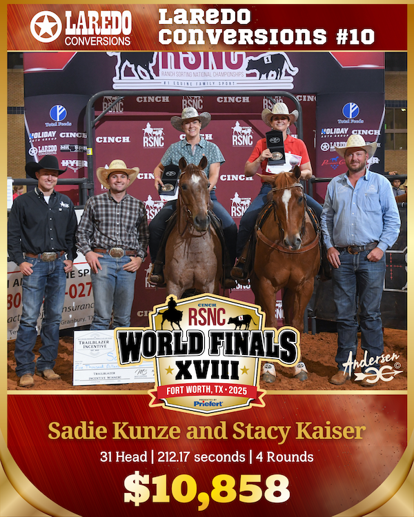 Sadie Kunze and Stacy Kaiser climbed to the top of the highly competitive Laredo Conversions #10, sorting 31 head of cattle in just 212.17 seconds to win $10,858 in earnings and World Champion buckles.