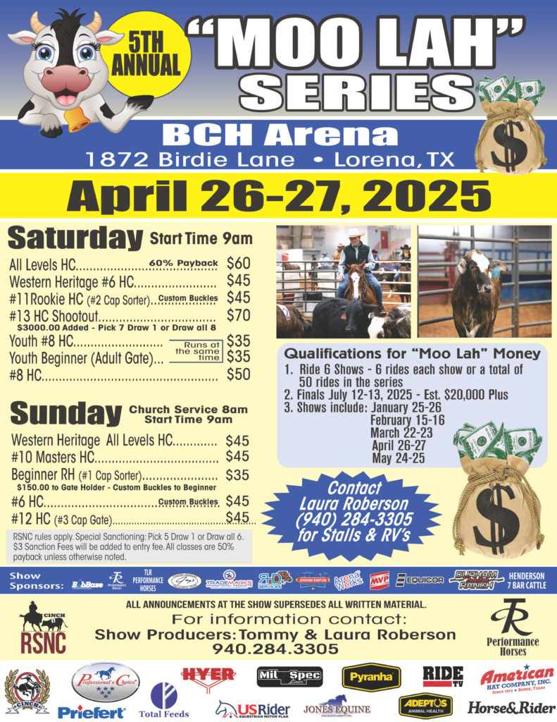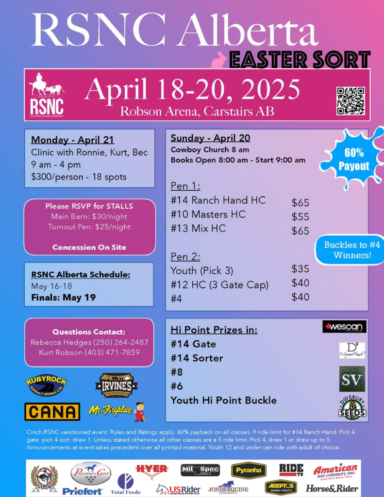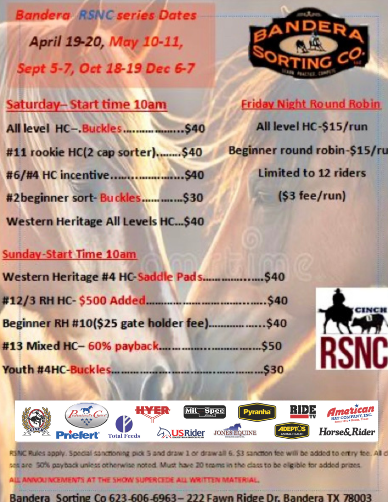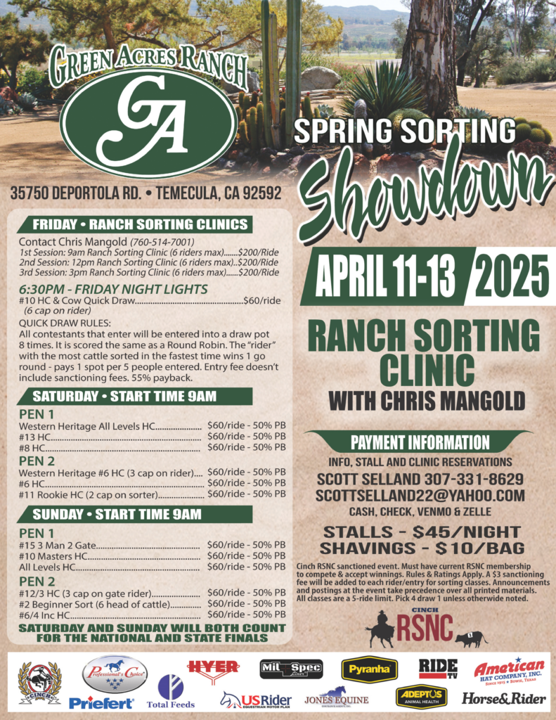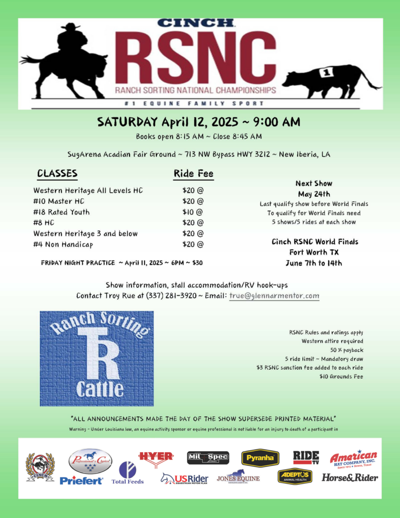 Hallelujah! The days are getting long again, which means more time for riding and ranch sorting in April. Join the Cinch RSNC family at any of the following events this month to celebrate Spring and maybe cash a check or two!
