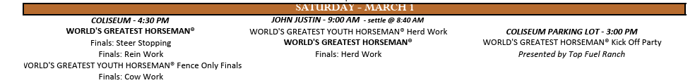 March 1, 2025 will be the day to catch the World’s Greatest Horseman finals action. The steer stopping, rein work, and cow work finals will all be held in the Will Rogers Coliseum beginning at 4:30 PM, with the herd work being held in the John Justin arena.