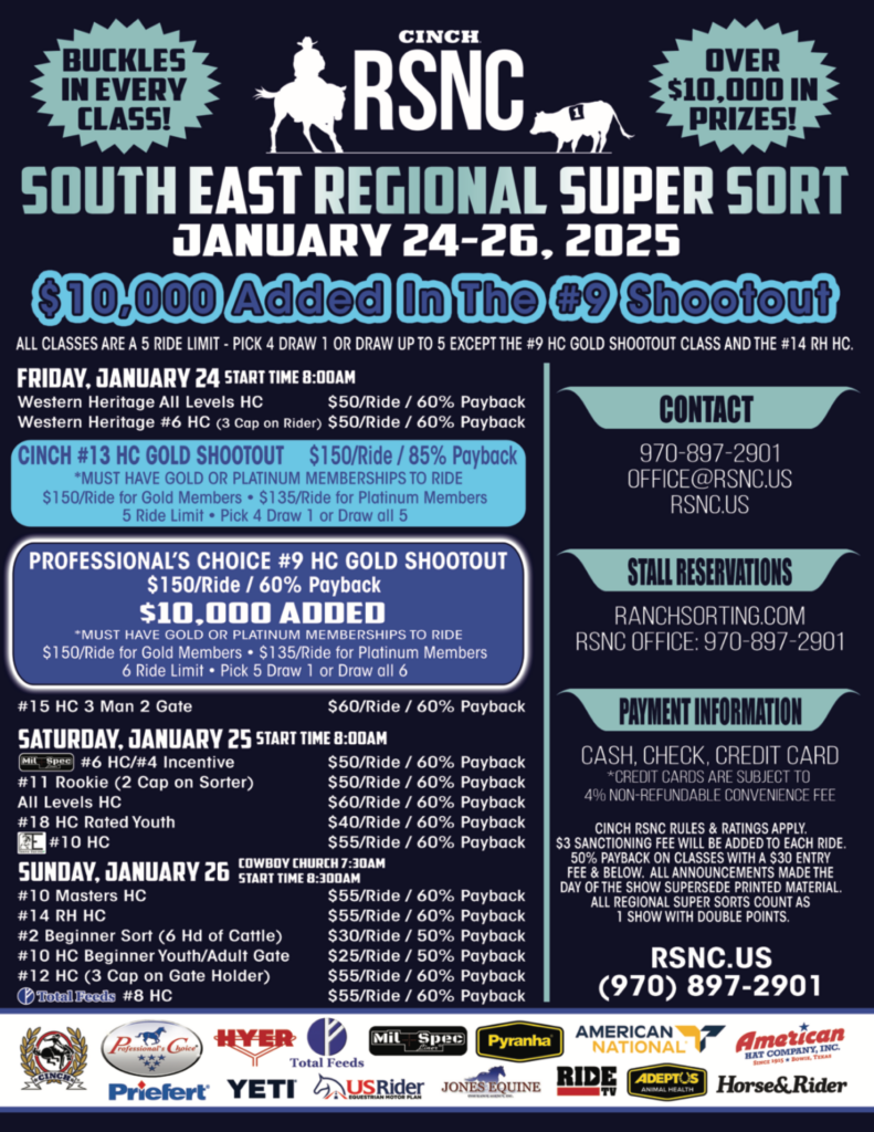 Held in Perry, Georgia, at the Georgia National Fairgrounds and Agricenter, the South East Regional Super Sort boasts $10,000 added in the Professional’s Choice #9 Shootout, a full regional prize line, trophy saddles and more.