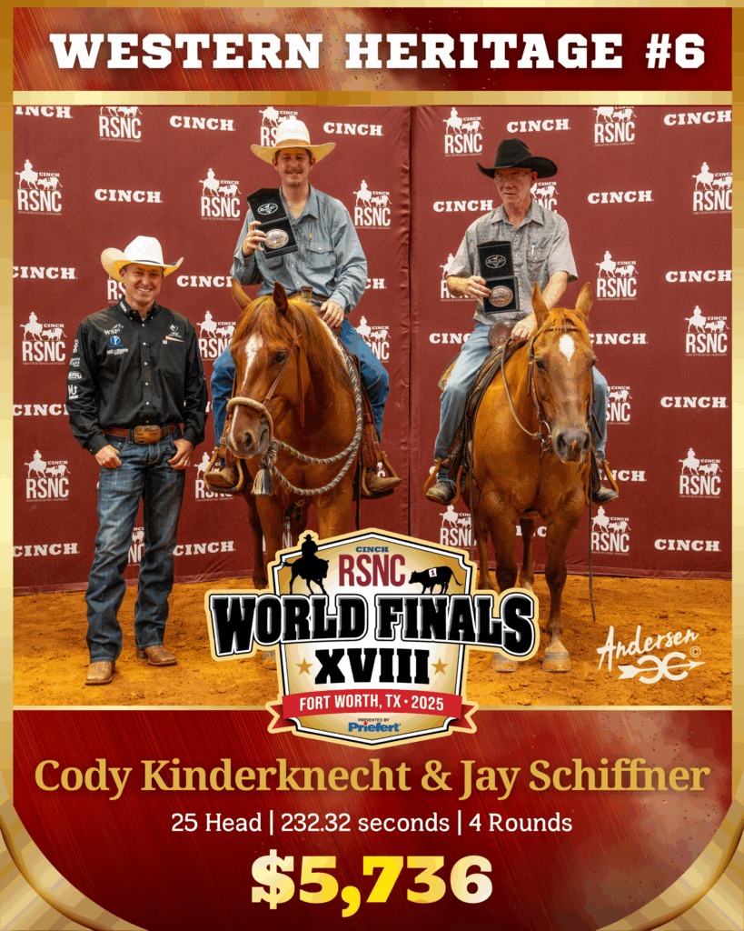After four rounds and 320 teams, Jay Schiffner of Waterloo, Illinois, and Cody Kinderknecht of Ogallala, Nebraska, rose to the top of the Western Heritage #6 class at the 2025 Cinch RSNC World Finals in Fort Worth, Texas. The duo, who had never ridden together before the class, sorted 25 cows in 232.32 seconds to claim the title and a combined payout of $5,736.
