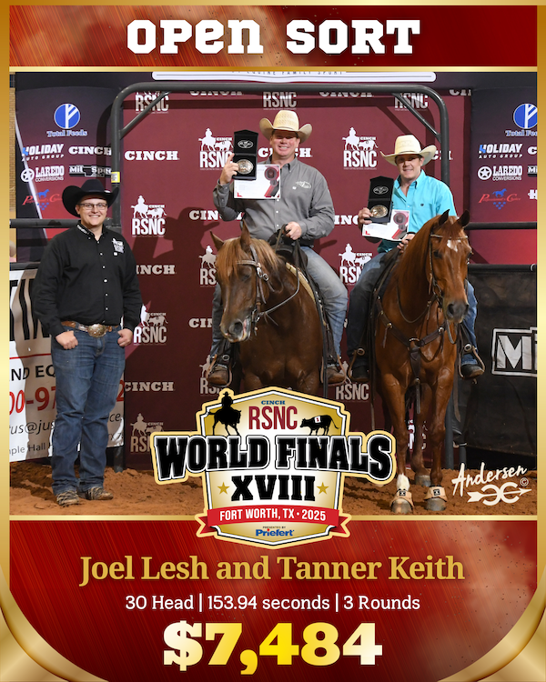 Tanner Keith of Austinville, Virginia, and Joel Lesh of Stillwater, Oklahoma, delivered a high-pressure, high-performance run to win the Open Sort at the 2025 Cinch RSNC World Finals in Fort Worth. The duo sorted 30 head of cattle in 153.94 seconds across three rounds to take the championship and $7,484 in prize money.