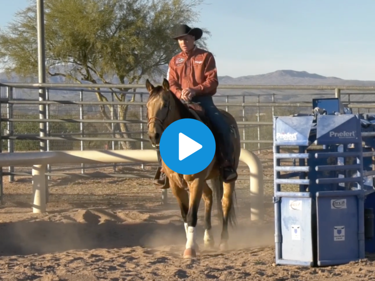 A rider in a black cowboy hat and show jacket guides a sorrel cutting horse as they work a cow away from the herd in an indoor arena. Large sponsor banners and cattle line the background, and sand kicks up under the horse’s hooves as it makes a sharp turn.
