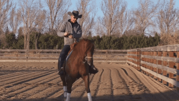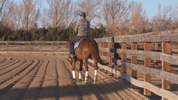 “I’ll use a fence as a tool to help teach the rollback because you want your horse to come over their hocks and come out at a lope. I’m going to back my horse up along the fence, ask them to turn through toward the fence, then lope off.”