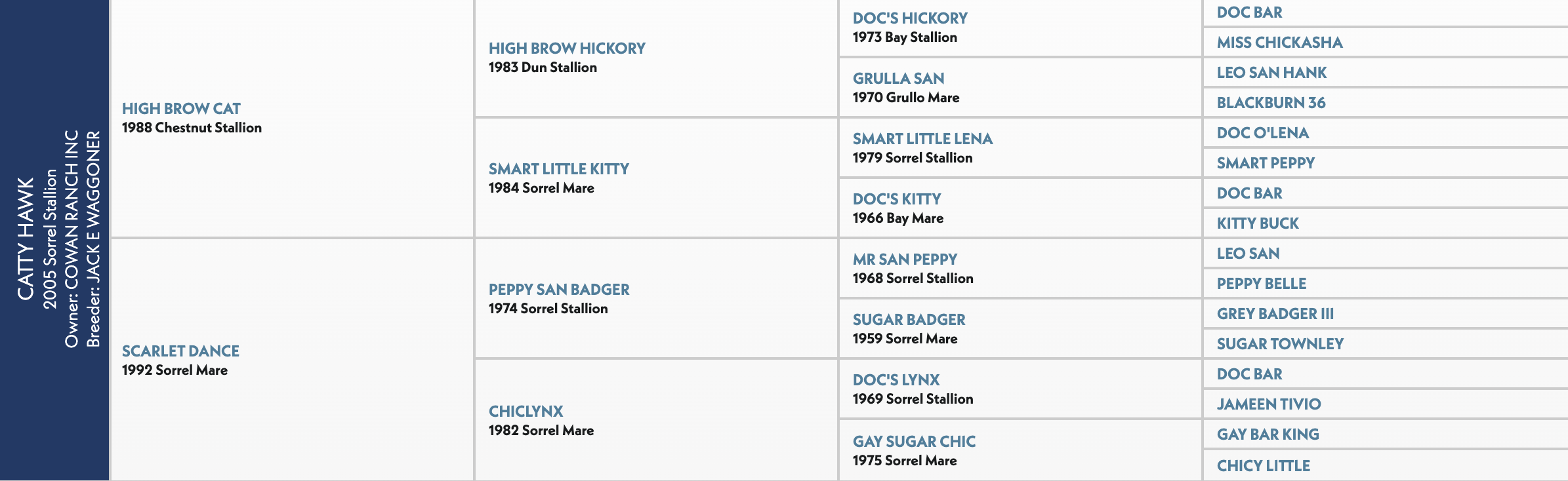 Sired by $97 million stallion High Brow Cat and out of Peppy San Badger mare Scarlet Dance, Catty Hawk built his reputation in the cutting pen, earning $240,297 in NCHA competition between 2008 and 2013 and etching his name into sire stardom in the years since.