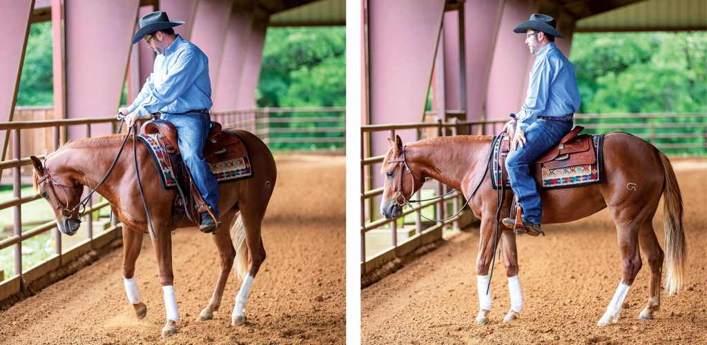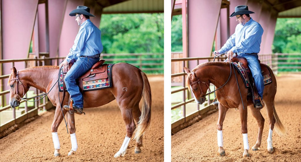 I put my left leg on my horse’s side and take note on how she responds to the pressure. My spur is only an extension of my leg and shouldn’t be the first thing to touch my horse’s side. If my horse doesn’t respond to my original leg cue, then I’ll go to my spur to encourage movement.