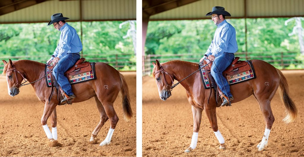 The biggest thing to remember is to take your time during a drill like this. After I successfully move my horse’s hips and shoulders to the right a few steps, I’m going to sit and stand to let her soak in all the information I just gave her.