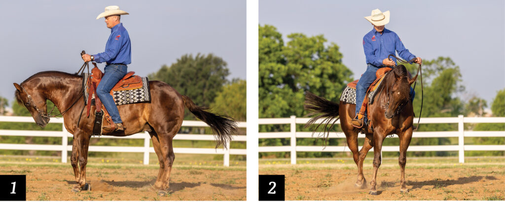 If your horse is dull to your leg, or he’s getting behind the motion, focus more on moving him forward and off your leg and don’t focus so much on the actual forehand turn. That comes with time. If he’s getting stuck, I use more leg to step on the gas pedal. Once he starts to move away from the pressure, I’m going to step off the gas and go back to less leg pressure.