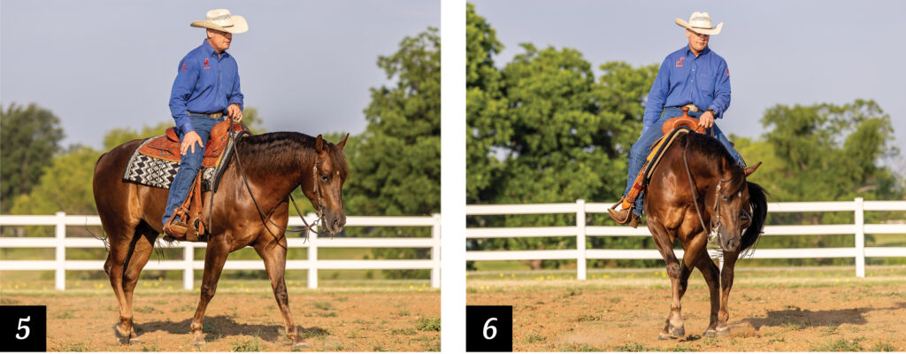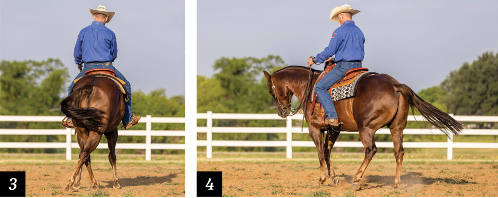 It’s easy to catch yourself leaning in one direction or another, especially when you’re riding by yourself and don’t have anybody watching you, but I make sure to sit in the center of the saddle to ensure my horse stays balanced underneath me. My left calf is still under my hip and is pushing my horse’s hip around, while my right leg is more forward to block the shoulder, but still open enough that he has somewhere to go. His left hind leg is crossing in front of his right hind leg, keeping the forward motion I need to complete this maneuver.