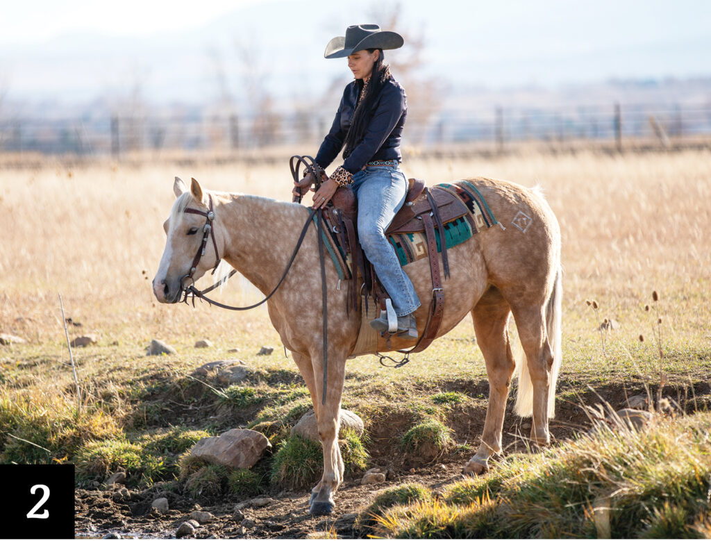Once I give my horse the chance to look around at her surroundings, I ask her to walk back forward so that I have control of the feet again. I’m going to get to a flat surface above the water crossing and safely turn my horse around so I can approach the water again. This time I might try to get some more forward motion. Because I need her to find her footing, I’m going to give her her head and sit deep in my saddle, and think about going forward and straight through the water.