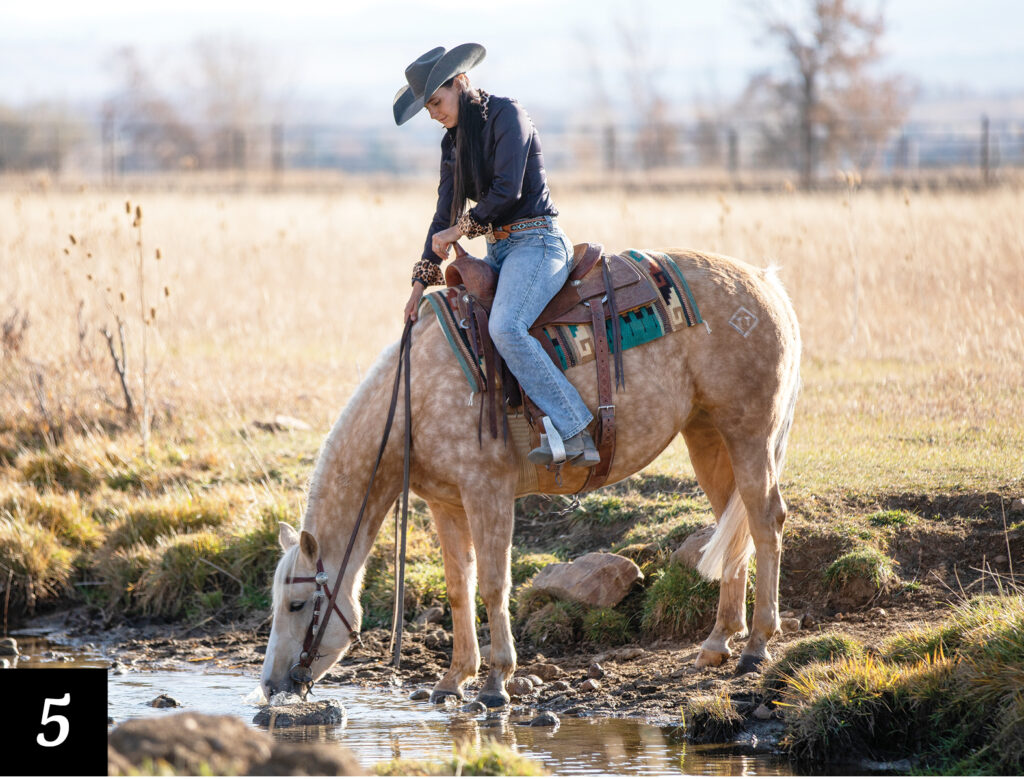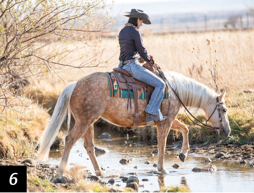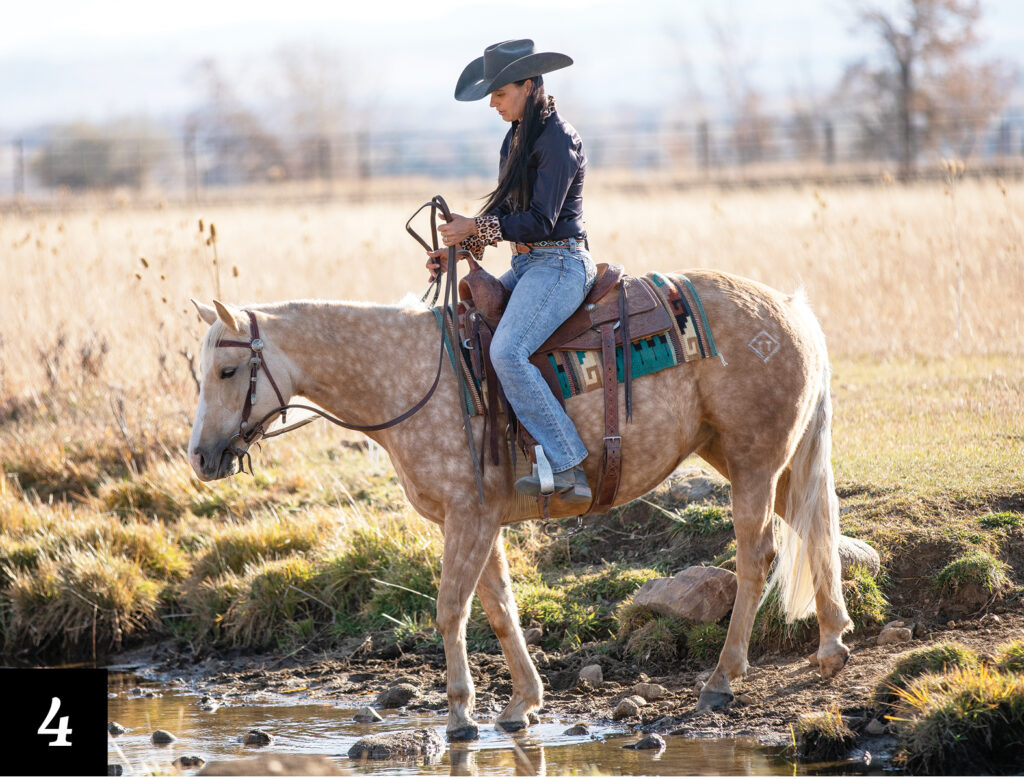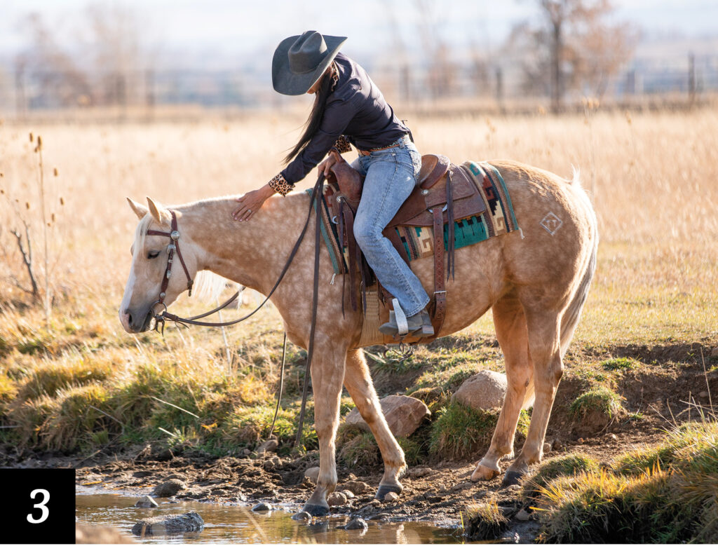 I’m going to gain my horse’s attention and get her focus back on what I’m asking her to do, which is go into this water crossing. I ask for just a couple of steps forward and then let her pause as a reward. I like that even though she is unsure of the crossing in front of her, she trusts me, and when I ask her to walk forward using my legs and voice, she takes a few steps forward, even if there’s some small hesitation.