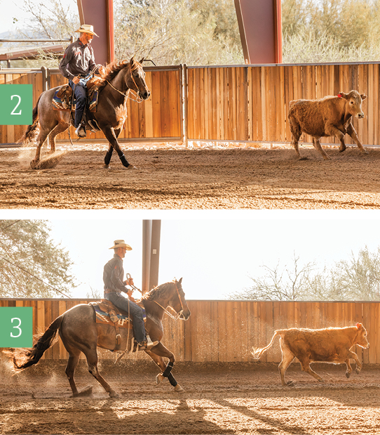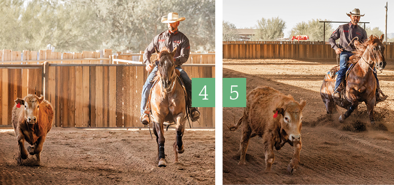 Step 3: As you approach the middle marker, it’s time start easing off the pressure. This is where your horse’s ability to rate the cow—adjusting his speed up or down—is essential. By gradually slowing down and shifting your position, you give the cow the opportunity to travel to the other end of the arena. At the same time, you’re setting yourself up to box the cow again.