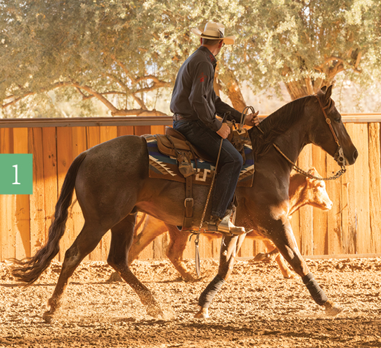 Practice this at home by using visual markers in your arena, whether it’s a banner, a post, or even a notch in the fence. Ask your horse to go forward as if you’re driving a cow down the fence. When you reach that marker, ask him to come back down to a steady, collected lope. If he responds right away, great—you’re on the right track. But if he doesn’t, that’s your cue to go back to the basics and work on getting a clear response from your seat and hands.